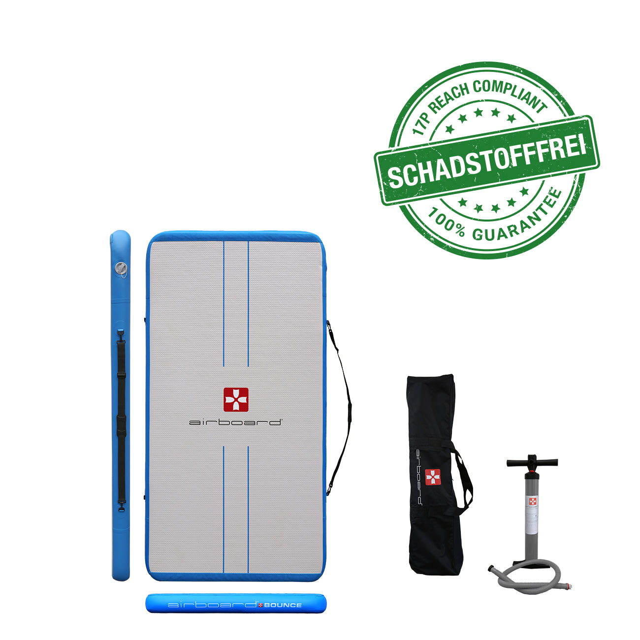 Airboard BOUNCE – dein flexibles und spassiges Trainingsgerät für die ganze Familie. Ob als Turnmatte für die Kinder, Trampolin oder Yoga-Matte. Die vielseitige aufblasbare Gymnastikmatte findet ihren Einsatz sogar als Badeplattform oder als Schlafmatte. Dank der gepolsterten, federnden Oberfläche kannst du überall sicher und komfortabel trainieren und deine sportlichen Fähigkeiten weiterentwickeln, und dies ganz ohne den Weg ins Fitnessstudio oder in die Trainingshalle. Die robuste Matte ist leicht platzsparend und lässt sich einfach in der mitgelieferten Tasche kompakt verstauen. Mit der Premium-Handpumpe ist die Matte in 2-3 Minuten einsatzbereit. Erhältlich in 2m und 3m Länge, beliebig erweiterbar und belastbar bis zu 160 kg. Entwickelt vom Lufttechnologie-Profi AIRBOARD® aus schadstoff-freiem 17P Reach PVC für höchste Qualität und Langlebigkeit.