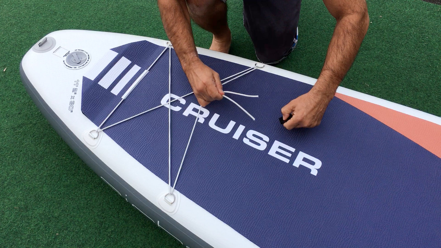 Seit 2023 verwenden wir auf den CRUISER und SKYLINE ein Quick-Fix Gepäcknetz. Damit kann das Gepäck nicht nur richtig fest angezogen werden, es bietet auch die Möglichkeit zur schnellen Montage (und Demontage) des neuen Gepäcknetzes hinten auf dem SUP. Diese Funktion wird ab 2023 nach und nach an verschiedenen Modellen eingefügt, ist aber an jedem SUP nachrüstbar.